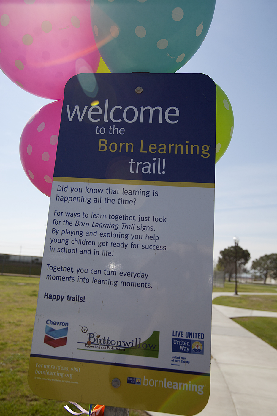 United Way of Central Eastern California, Chevron, and Buttonwillow Recreation and Park District installed Kern County’s sixth Born Learning Trail at Buttonwillow Park. The Born Learning Trail provides a fun way for parents/caregivers to interact with children from newborn to age five. The trail, a 10-station circuit course with learning activities at each station, is marked in English and Spanish.